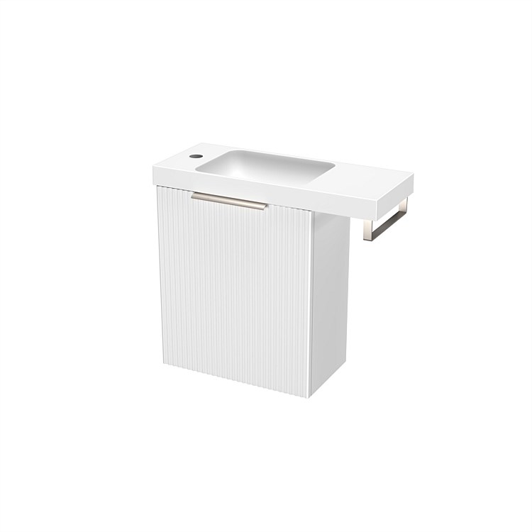 LeVivi Positano 600mm Wall-hung Vanity in Matt White with Towel Rail. Soft-close doors, durable polymarble top, customisable options.