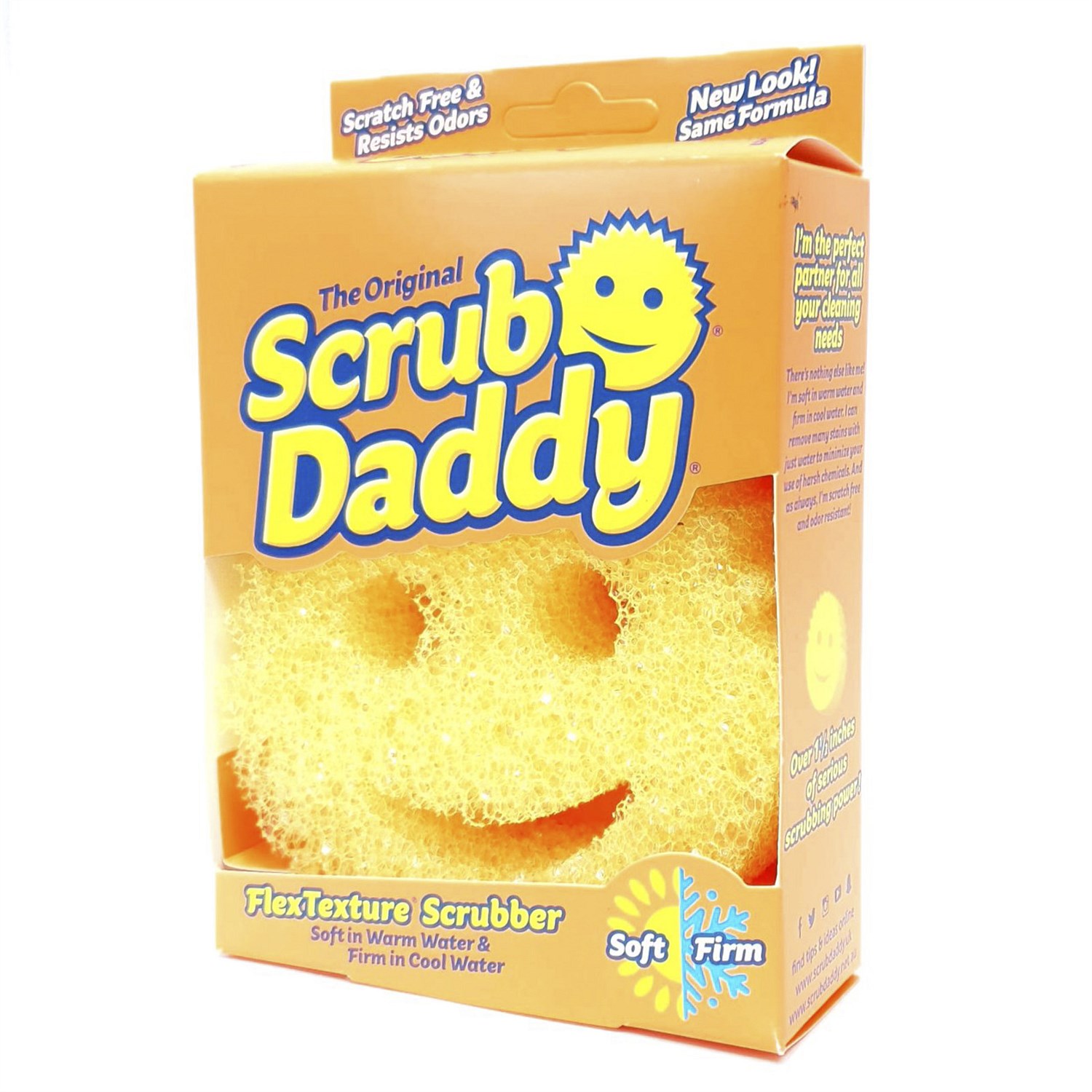 Scrub Daddy's FlexTexture® changes based on your water temperature! In warm water he's soft and more absorbent. In cool water he's firm for scrubbing seriously stuck-on messes. He's ergonomic, doesn't scratch, rinses free of debris, and resists odours for up to 8 weeks!